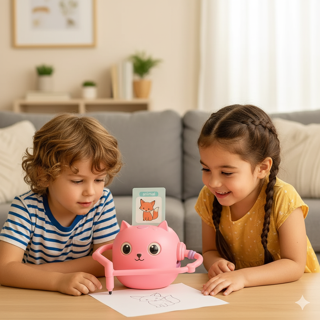 Wystarczy włożyć kartę z wzorem lub słówkiem, nacisnąć przycisk, a robot samodzielnie odtworzy rysunek na kartce. Dziecko może go potem kolorować lub odwzorowywać, rozwijając kreatywność i ucząc się przy tym angielskich słów.